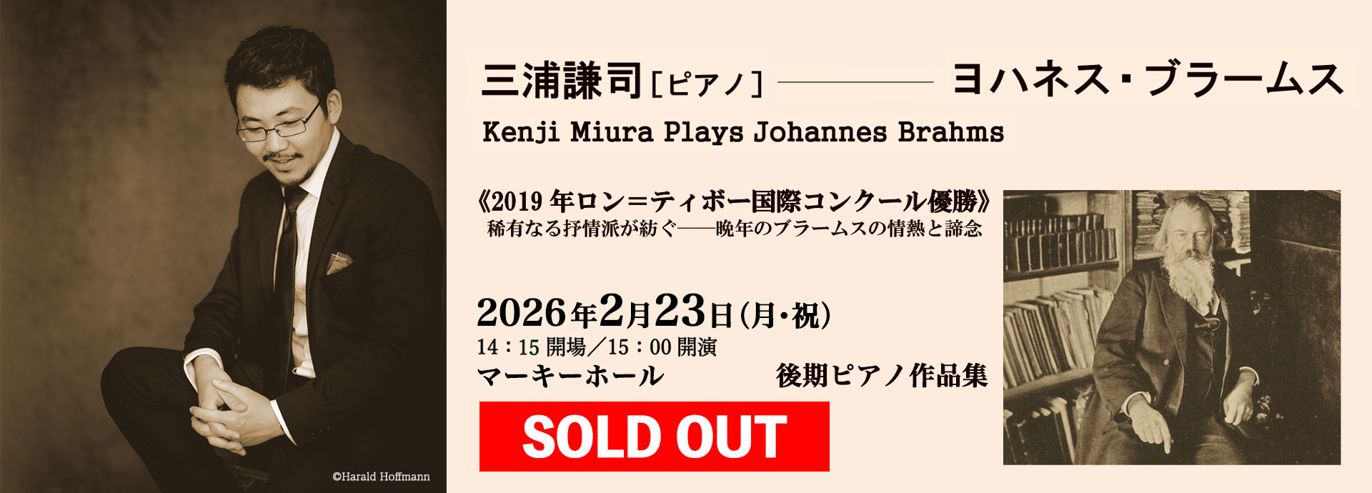 【完売御礼】2/23(月・祝)15:00開演「三浦謙司[ピアノ] ブラームス:後期ピアノ作品集」は、完売のため当日券販売はございません。